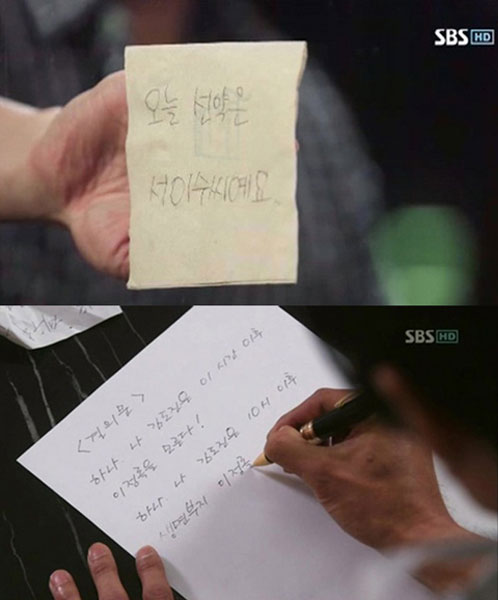 앞서 장동건이 결의문을 작성하는 장면에서도 그의 반듯하고 개성 있는 글씨체가 포착된 바 있다.