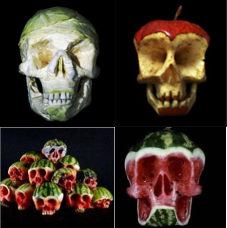'오싹한 과일들'은 수박, 양배추, 가지 등의 각종 채소와 과일이 오싹한 해골로 조각된 것이다.