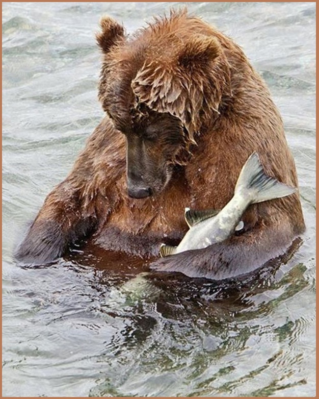 이 사진에는 곰이 물속에서 물고기를 안고 잠든 것 같은 모습이다.