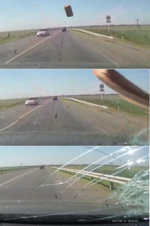 영상을 보면 운전자의 반대 차선에서 지나가던 대형 트럭이 벽돌을 떨어뜨려 이 벽돌이 영상의 운전자 차량 앞유리에 와서 부딪힌다.