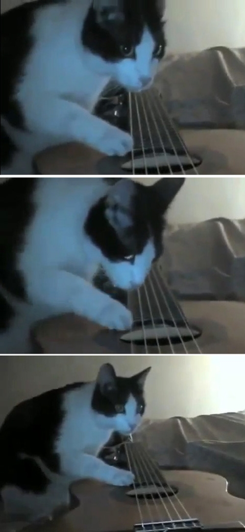 영상에서 고양이는 바닥에 놓인 기타를 긁어대며 놀이에 한창이다.