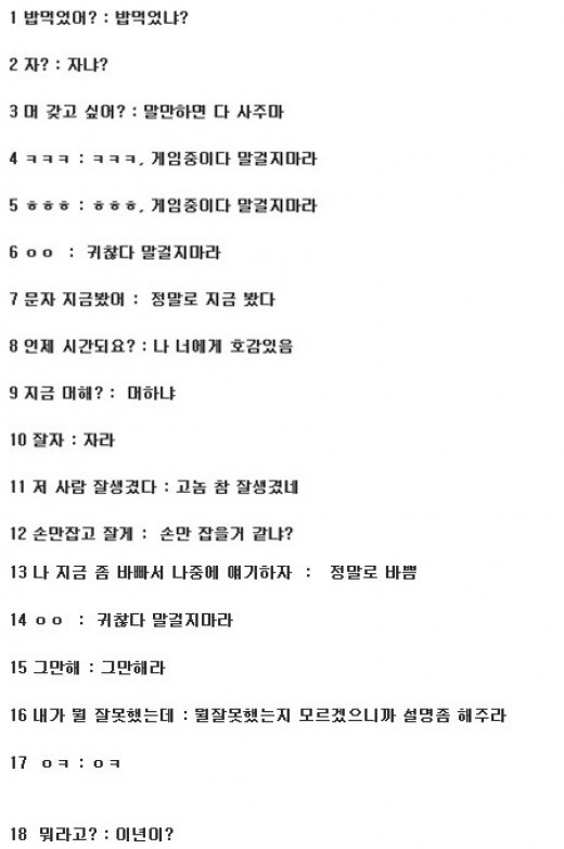 또한, ‘ㅋㅋㅋ’와 ‘ㅎㅎㅎ'는 ’게임 중이다 말 걸지 마라‘란 뜻을 ‘ㅇㅇ’, ‘ㅋㅋㅋ’, ‘ㅎㅎㅎ’ 등은 ‘귀찮으니까 말걸지 마’라는 뜻을 담고 있고, ‘손 만 잡고 잘게’는 ‘손만 잡을 거 같냐?’란 뜻을 가지고 있어 웃음을 자아낸다.