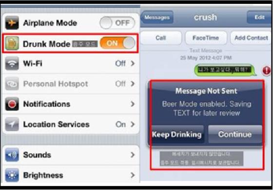 공개된 사진에는 스마트폰에 'Drunk Mode(음주모드)' 기능이 있어 이 기능을 'ON' 상태로 켜놓으면 술을 마신날 보내는 메세지가 차단된다.