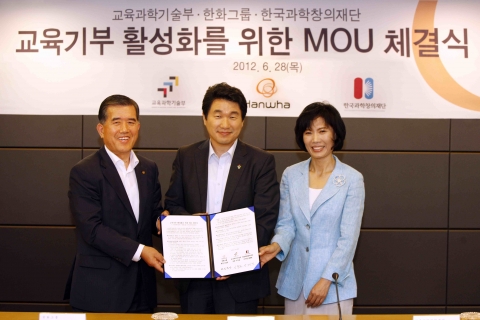 한화는 28일 서울 장교동 한화빌딩 21층 컨퍼런스룸에서 이주호 교육과학기술부 장관, 강혜련 한국과학창의재단 이사장, ㈜한화 심경섭 사장 및 관계자들이 참석한 가운데 교육기부 활성화를 위한 업무협약(MOU)을 체결했다.