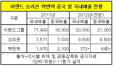 이랜드와 오리온, 락앤락의 올해 중국매출이 국내 매출을 넘어서는 기염을 토하고 있다.