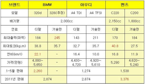 가격은 아우디 A4가 4천430만~5천610만원, BMW 320d 4천500만~5천650만원, 벤츠 C200 4천620만~5천240만원 C220 5천290만원으로 거의 비슷한 가격대에 몰려 있다.