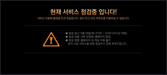 라이엇게임즈는 28일 오전 7시부터 한국서버 안정화와 홈페이지 점검을 이유로 게임 서비스를 일시 중단하고 이를 홈페이지 메인에 공지했다.