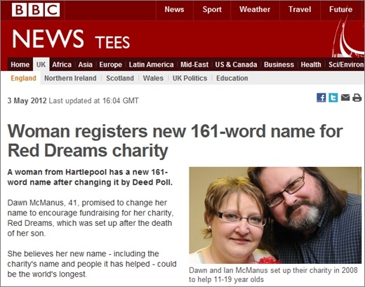 가장 긴 이름의 주인공은 영국의 돈 맥마너스(Dawn McManus)라는 여성으로 지난 5월3일(현지 시간) 161개의 단어로 이루어진 이름으로 개명했다. 이유는 아들의 죽음 이후 설립한 자선단체를 홍보하기 위해서다.