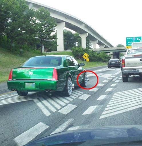 특이한 점은 이 차량의 바퀴에는 뾰족한 것이 박혀 있어 다른 차가 옆에 붙었다가는 큰 일이 날 듯한 모습이다.