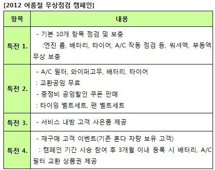 이번 캠페인은 7월2일부터 14일까지 진행되며 엔진 룸, 배터리 등 기본 10개 항목에 대한 점검 서비스가 제공된다.