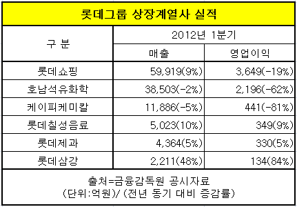 핵심계열사인 롯데쇼핑의 영업이익도 전년 동기보다 19% 떨어진 3천649억원을 기록했다.