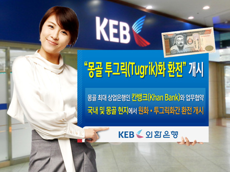 이번 투그릭화 환전 확대 시행으로 현지에서 재환전 없이 사용할 수 있게 됐다. 또 외환은행은 몽골 최대 영업망을 가지고 있는 칸뱅크(Khan Bank)와의 업무협약에 따라 몽골현지에서 원화 환전이 가능토록했다.