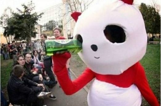 사진에는 곰돌이 탈을 쓴 사람이 병맥주를 눈에 꽂고 마시고 있다. 결국 이 사진은 곰돌이 의상을 입은 사람의 사진으로 마치 진짜 곰이 눈에 안약을 넣고 있는 것 처럼 보인 것.