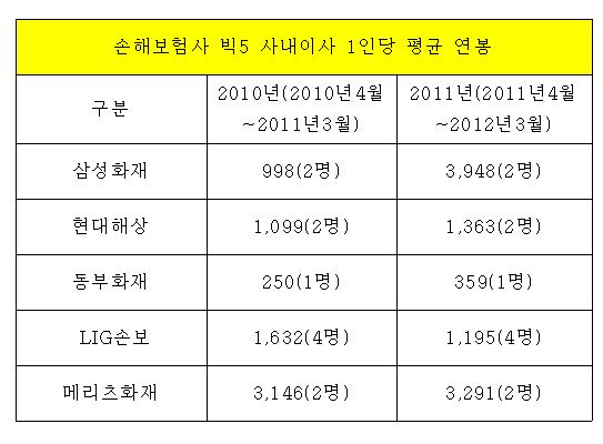 특히, 올해 초 최고경영자(CEO)가 김창수 대표로 교체된 삼성화재의 경우 지난해(2011년4월~2012년3월) 사내이사 1인당 평균 지급액은 39억원에 달했다. 이 같은 임금 급증은 지대섭 삼성화재 전 대표의 성과급과 퇴직금 등이 반영된 것으로 풀이되고 있다.