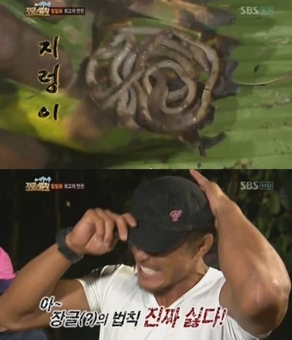 지렁이는 추성훈이 도전했는데, 그는 이를 맛보고 "정글의 법칙 너무 싫다"고 또 한번 진저리를 쳤다.(사진=방송캡처)