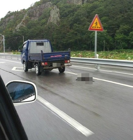 앞서 지난달 30일 한 포털사이트 게시판에 '개를 끌고 다니던 트럭을 보았습니다'란 제목의 글이 사진과 함께 게시되면서 '악마 트럭' 논란이 일었다. 사진은 한 개가 목줄에 매인 채 적재함 밖으로 떨어져 끌려가고 있는 모습을 담고 있다.(사진=온라인 커뮤니티)