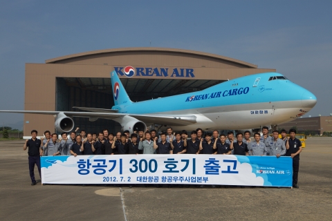 대한항공은 2일 부산 대저동 테크센터 내 페인트 격납고에서 항공기 도장 300호기 출고 행사를 실시했다고 밝혔다.