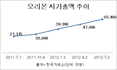 오리온 시가총액은 작년 7월 1일 2조7천375억원에서 올해 1월 2일 3조9천368억원으로 43.8% 늘더니 지난 2일 5조5천483억원을 기록하면서 1년 만에 2조8천억원이나 늘었다.