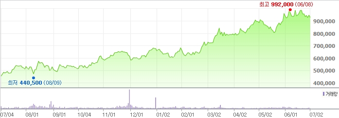 지난 4월 말부터 5월 초에 걸쳐 잠시 90만원대를 들락날락했다가 이내 80만원대 초반으로 떨어졌던 오리온 주가는 6월 들어 한때 99만2천원까지 치솟기도 하는 등 최근 90만원대에 안착하는 모습을 보이고 있다.