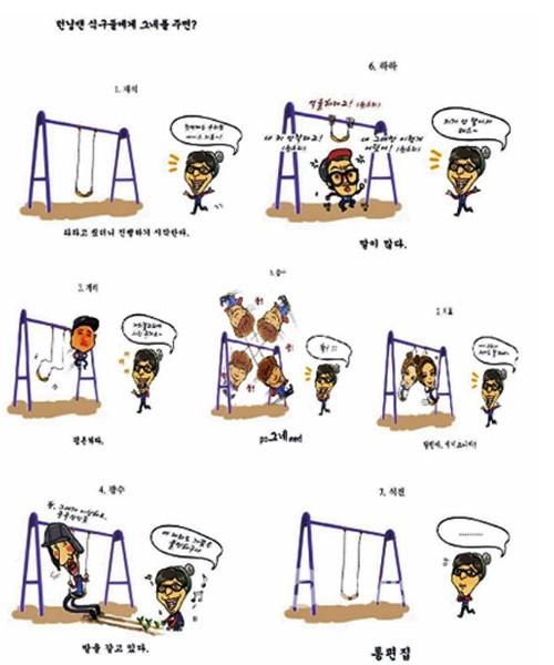 '런닝맨 멤버들 그네타면’은 한 온라인 커뮤니티 게시판에는 올라온 것으로 런닝맨 멤버들에게 그네를 주면 벌어지는 상황을 그리고 있다.