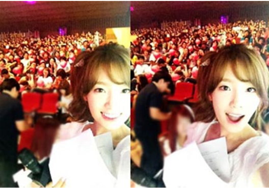 사진에서 태연은 관객석을 등 뒤로하고 셀카를 찍고 있다.