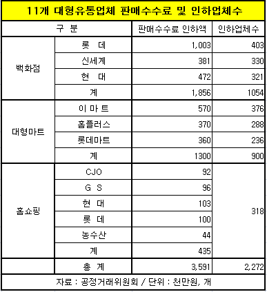 공정거래위원회가 11개 대형유통업체들의 판매수수료가 연간 약 358억원 인하된 것으로 추정된다고 3일 밝혔다.