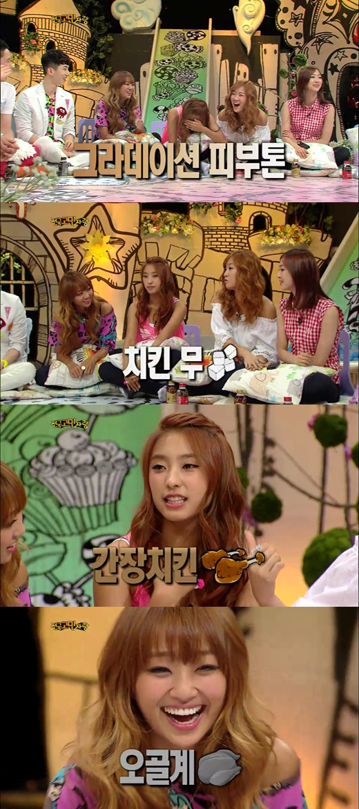 소유는 "저희를 치킨에 비유한 글이 있다'라며 "다솜은 치킨 무, 소유는 백숙, 보라는 간장치킨, 효린은 오골계이다"고 말해 스튜디오를 웃음바다로 만들었다.