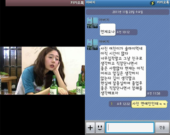 작성자가 프로필 사진으로 저장해둔 술취한 여성의 사진을 보고 아들의 여자친구라고 생각한 아버지는 "여친이 술 마이 먹네. 너무 집착하지 말고 그냥 친구로 생각해라. 아직 어리니 앞길은 생각하지 말고 현실에 충실하며 장래를 생각하자"고 조언했다.