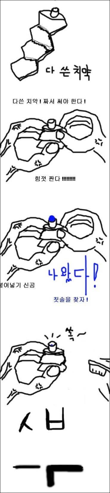 최근 온라인 커뮤니티 게시판에는 '치약 쓸 때 공감'이라는 제목의 웹툰이 게재됐다. 4컷으로 구성된 이 웹툰은 치약을 다 쓴 후 마지막 남은 치약을 힘껏 짜 쓰는 과정을 담고 있다.그림 속 주인공은 양손을 이용해 젖먹던 힘까지 쥐어짜 간신히 치약을 짜낸다.