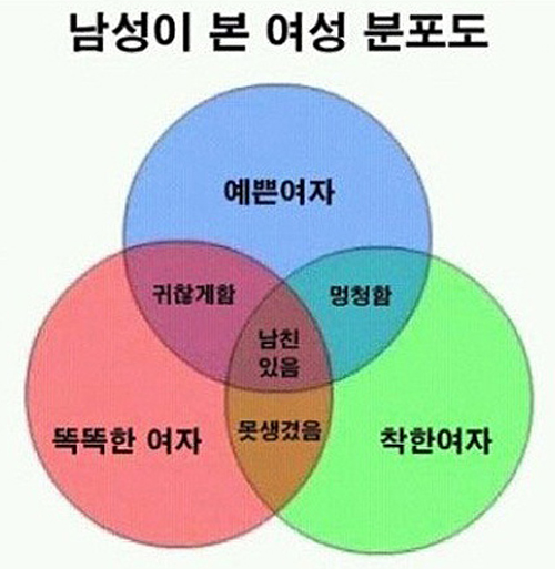 이 도표를 살펴보면 예쁜 여자와 똑똑한 여자는 남자를 귀찮게 한다. 또 예쁜 여자와 착한여자는 멍청하다는 교집합이 있다.