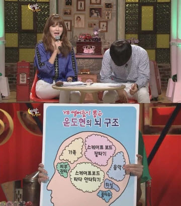 4일 방송된 SBS '한밤의 TV연예'에서 MC 수영은 윤도현 기습 인터뷰를 시도하며 YB멤버들이 작성한 윤도현의 뇌구조를 공개했다.