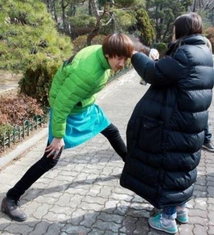 장신인 이광수는 사진에서 스타일리스트를 위해 다리를 벌리고 허리를 숙이고 있다.