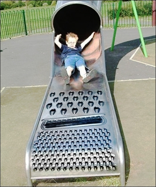 특히 소년이 타고 내려오는 미끄럼틀은 마치 채소나 과일을 갈아내는 강판처럼 울퉁불퉁 튀어나와 보는 이들의 눈길을 끌고 있다.