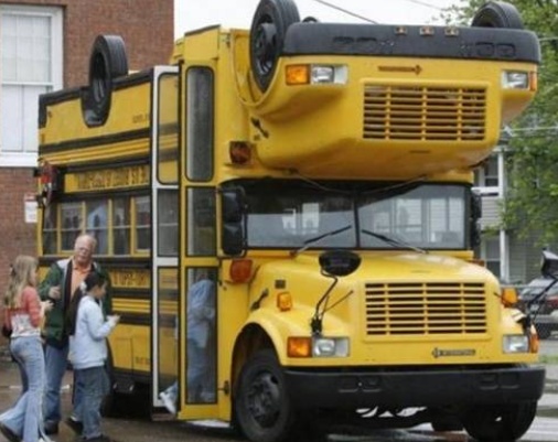 사진 속 '뒤집혀도 괜찮은 버스'는 버스가 2층 형태로 돼 있다. 자세히 살펴보면 2층 버스는 버스를 뒤집어놓은 형태를 띄고 있다.