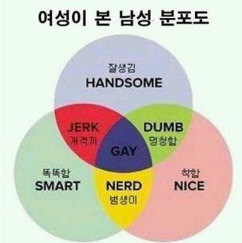 이 ‘여성이 본 남성분포도’에서 잘생기고 착한 남자는 멍청하다는 교집합이 있고, 착하고 똑똑한 남자는 범생이, 잘생기고 똑똑한 남자는 나쁜놈이라는 공통점이 있다.