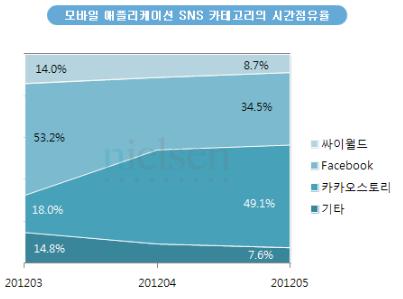 닐슨코리아클릭이 최근 내놓은 ‘모바일 애플리케이션 SNS 카테고리의 시간점유율’ 보고서에 따르면 카카오스토리는 국내 모바일SNS 시간점유율 49.1%로 페이스북, 싸이월드 등을 제치고 1위에 올랐다.