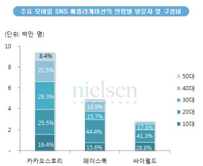 특히 카카오스토리는 페이스북이나 싸이월드에 비해 30대 이상의 중장년층 이용자 비율이 압도적으로 높았다.