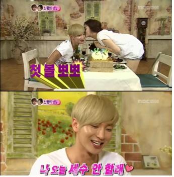 이어 이특이 ‘소원 1회 자유이용권’ 쿠폰을 보며 "뭘 들어달라고 할 것 같으냐"고 묻자 강소라는 "예상되는 게 있다. 방송에서 말하기가 좀 그런데"라며 귓속말을 하는 척 이특에게 다가섰다. 그러더니 이특의 볼에 기습 키스를 했고 이특은 부끄러워하면서도 "나 오늘 세수 안 할래"라며 기뻐해 웃음을 자아냈다.(사진=MBC 방송 캡처)