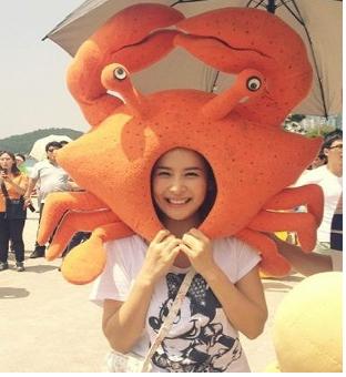 사진 속 조여정은 커다란 꽃게 모양 탈을 쓰고 해맑은 웃음을 짓고 있다. 귀여운 캐릭터 티셔츠에 오랜지색 핫팬츠의 내추럴한 매력이 돋보인다.