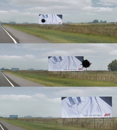 사진은 외국의 한 도로에 설치된 전광판 광고를 찍은 것으로, 원근법을 이용해 세제의 효능을 어필했다. 멀리서 봤을 때에는 흰색 와이셔츠에 새까만 얼룩이 커다랗게 묻어 있는 것으로 보이지만, 자동차를 타고 전광판에 가까워질수록 와이셔츠에 묻은 얼룩이 점점 사라진다.