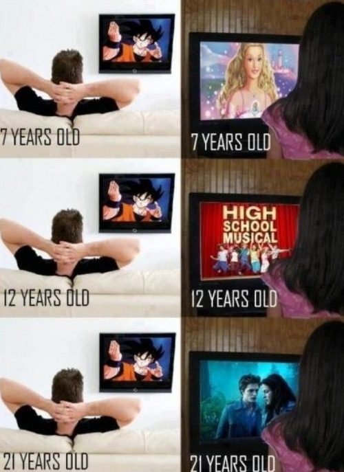 남자는 쭉 만화만 보는 반면 여자는 디즈니 만화영화, 하이틴 드라마, 로맨스가 가미된 영화로 변화를 주고 있다.
