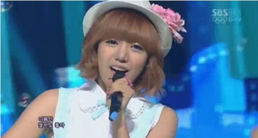 에이핑크는 깜찍하고 귀여운 원피스 패션으로 무대에 올라 후속곡 '부비부' 무대를 선보였다. 뮤티즌송은 에프엑스가 2주 연속 차지했다.(사진-SBS 방송 캡처)