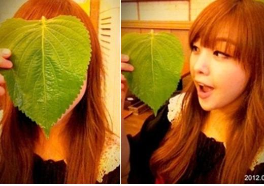 공개된 사진에서 민아는 커다란 깻잎을 들고 얼굴을 가리고 있다.