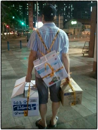 특히 한 상자는 테이프로 감아 어깨에 백팩처럼 메고 있어 눈길을 사로잡았다.