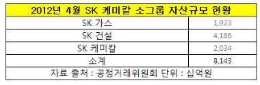 10일 공정거래위원회에 따르면 2012년 4월 기준 SK케미칼, SK가스, SK건설의 자산규모총액 합은 8조1천430억원 규모다. SK건설이 4조1천858억원으로 가장 컸고 SK케미칼이 2조338억원, SK가스가 1조9천231억원으로 그 뒤를 이었다.