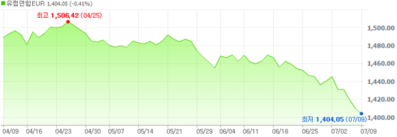 유로화에 대한 원화의 환율은 9일 오후 4시 현재 1천404.05원으로, 한달여 만에 최저 수준을 기록하며 약세를 이어가고 있다. 유로화 가치가 계속 떨어지면 삼성전자가 유럽에서 거둬들이는 매출과 이익은 자연히 줄게 된다.