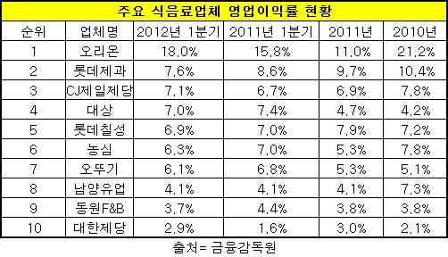 오리온은 올해 1분기 기준 영업이익를이 18%로 주요 식음료업체 가운데 가장 높았다. 오리온은 지난 2010년과 2011년에도 상위 10대 기업 가운데 영업이익률 부동의 1위를 기록한 바 있다.