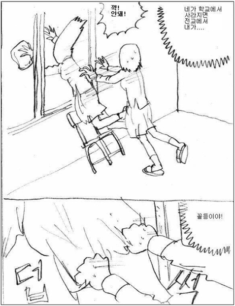 하지만 다음 컷은 반전 그 자체다. 떨어지는 친구를 붙잡고 있는 것. 만화를 보면 "(네가 죽으면 내가)꼴등이야!"라는 말로 처리돼 있어 반전과 함께 웃음을 준다.