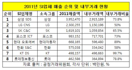 국내 1위 업체인 삼성 SDS는 내부거래액이 SK C&C의 3배나 되고 내부거래비율도 73.8%로 평균을 웃돌고 있다. 매출을 거의 계열사에 의존하고 있는 KT DS(99.7%)와 현대 오토에버(89%)도 부당지원 조사를 피했다.