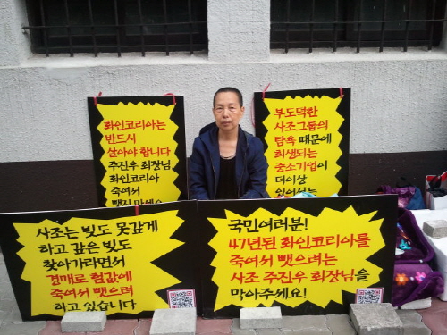 최선 화인코리아 사장은 지난달 26일 서울 충무로에 위치한 사조그룹 본사 앞에서 무기한 단식농성에 들어갔다. 자신이 남편과 함께 경영하고 있는 가금류업체 화인코리아를 사조그룹이 편법 인수하려 한다는 것이 최 사장이 농성에 들어간 이유다.